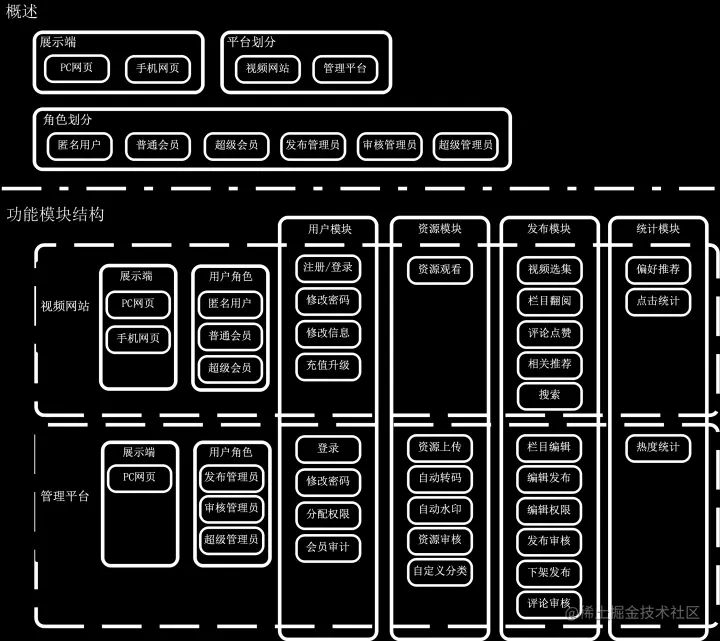展示端,指的是PC网页、手机网页、APP等 ;平台,指的是网站前台、管理后台等 。然后,划分功能模块,并把功能点整理到对应的平台当中 。这里需要注意的是,功能点不需要太全,只需要把主要的功能体现出来就可以了 。另外,功能模块的划分不需要考虑程序是如何实现的,这里的功能模块说白了就是功能分类,只需要根据功能点划分即可 这样,功能模块结构就能清晰的表达出来了