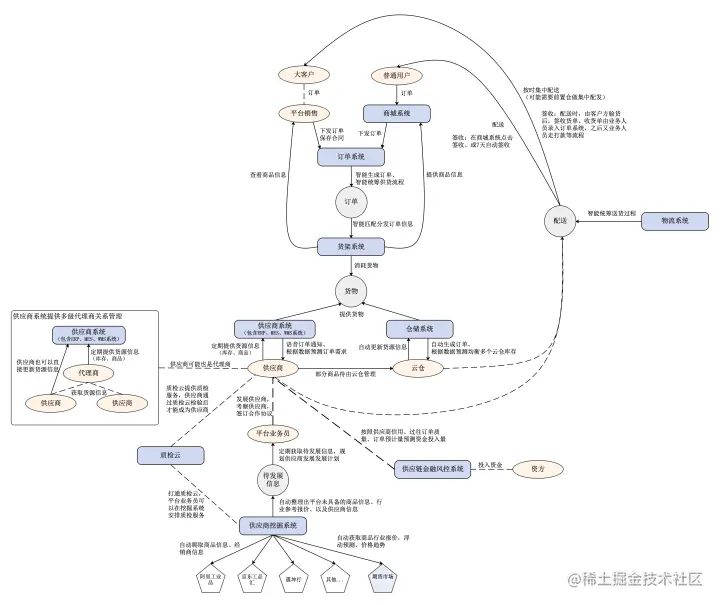 核心业务逻辑图体现的是 “谁”在“什么平台”操作了“什么资源” 。图中的椭圆形表示用户角色、矩形表示平台、圆形表示资源 。核心业务逻辑图可以根据场景切分成多张小图,也可以用一张大图展示出来
