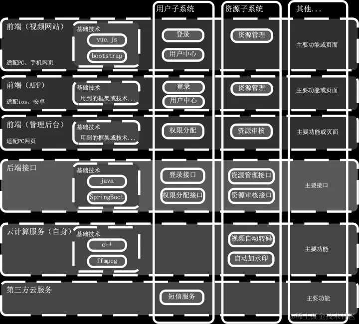 以一个中大型的B/S架构网站为例, (1)前端指的是视图层,包括PC网页、手机网页、APP等; (2)后端指的是业务处理层,一般是API接口,处理的是业务请求,如数据的增删改查等; (3)云计算服务处理的是运行时间比较长的任务,一般受后端软件调度,如视频转码、智能审核等; 云计算服务可能是第三方云计算服务平台提供的,也可能是自身团队开发的。 需要注意的是:这里需要选定好开发用到的技术,如Java、Springboot、MyBatis、VUE等 另外根据业务架构划分好子系统,且把主要的功能点体现出来。