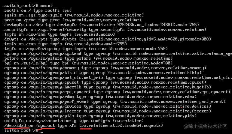 发现是只读的。需要重新以rw方式挂载/sysroot 。