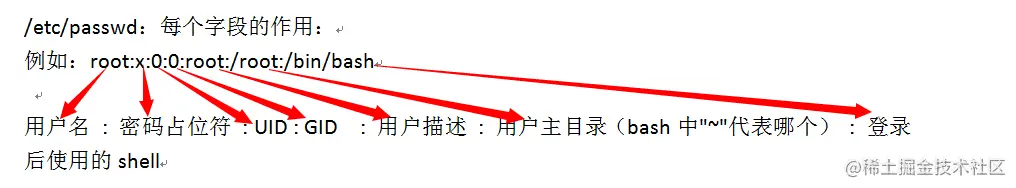 | 用户配置文件 | /etc/passwd | 记录了每个用户的一些基本属性,并且对所有用户可读,每一行记录对应一个用户 |