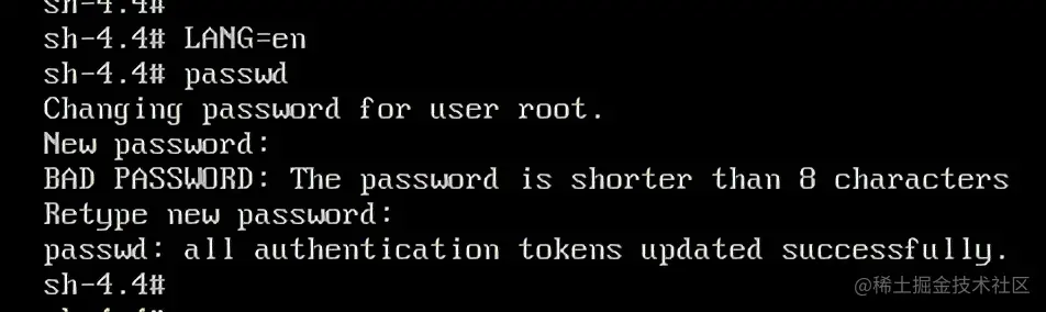 注:如果系统的selinux开启着,则需要执行命令: touch /.autorelabel以更新系统信息,否则重启之后密码修改不会生效,先退出当前根,reboot重启系统。我们已经关闭selinux,不需要创建/.autorelabel 。