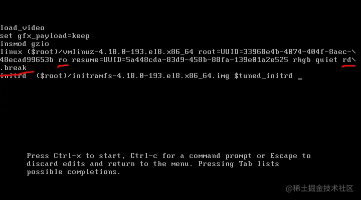#进入编辑模式后会看到这些信息,默认情况,都是以ro只读方式引导系统进入