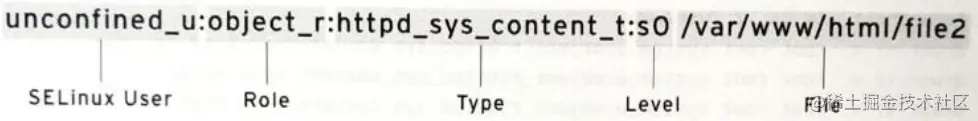 SELinux 标签具有多种上下文:User用户、Role角色、Type类型和Level敏感度级别。目标策略会根据第三个上下文(即Type类型上下文)来制定自己的规则,通常以_t 结尾