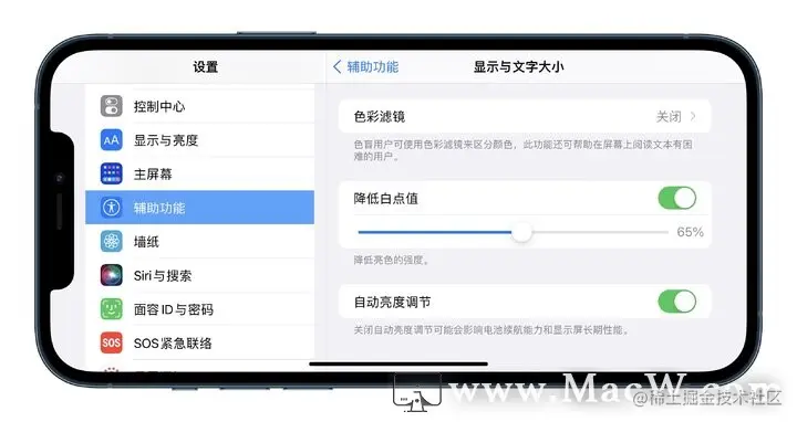 深夜玩手机,即便屏幕亮度已经调到最低,但还是会感觉刺眼。这时,你可以在辅助功能中,找到「降低白点值」,打开并滑动降低亮色的强度,直到你感觉舒服为止。