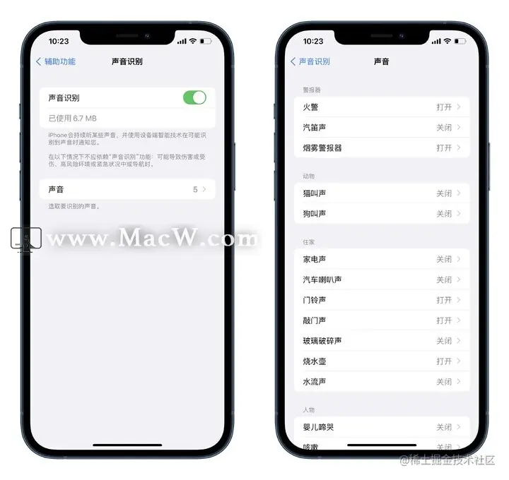 声音识别功能,可以让 iPhone 辨认某些特定声音,比如警报声、动物声、居家生活中的各种生活等。