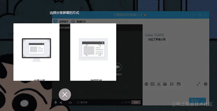 第三步:点击分享屏幕后,会出现【全屏分享】和【选择区域】,根据自己的情况选择任意一种即可。