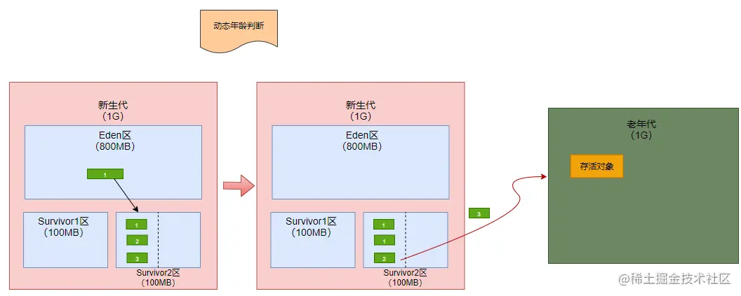 此时我们可能会疑惑,当survivor区的对象堆满了放不下了,或者来一个超大对象survivor区放不下,在这种情况我们如何处理,因此后面将介绍新生代对象是如何晋升到老年代的。