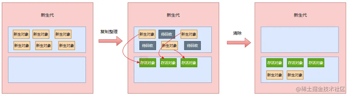 - 首先将新生代内存分为两块区域,一块用于存储对象,另一块为空白内存,当触发垃圾回收时,对存活对象进行标记,并将其复制到空白区域并紧凑地排列,并将原来的区域一扫而空。两块区域就这么循环使用。