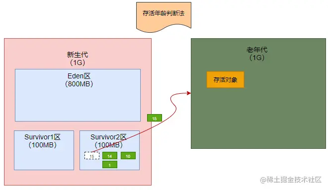 当对象的年龄达到15岁时,也就是躲过了15次GC过后,该对象就被转移到老年代。