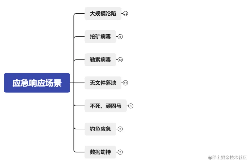 事件类型分为7类:大规模沦陷、挖矿病毒、勒索病毒、无文件落地、不死(顽固)马、钓鱼应急响应、数据劫持。【后续会细讲】