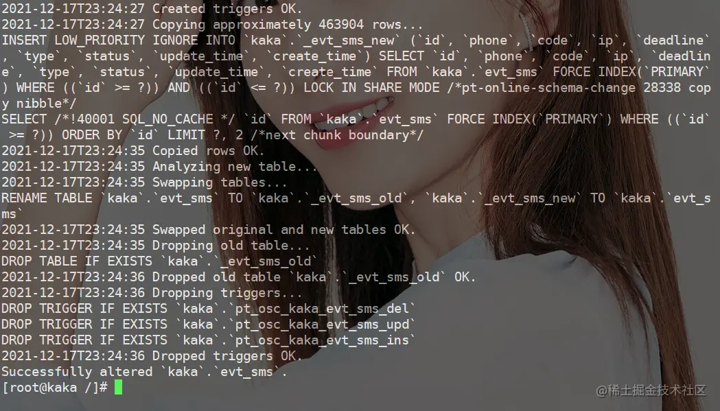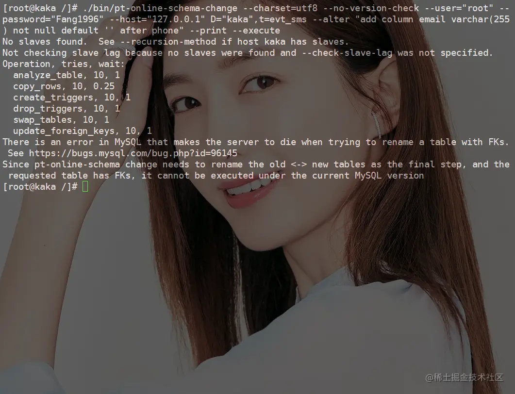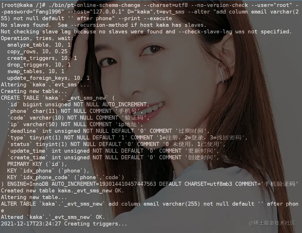 执行代码./bin/pt-online-schema-change --charset=utf8 --no-version-check --user="root" --password="Fang1996" --host="127.0.0.1" D="kaka",t=evt_sms --alter "add column email varchar(255) not null default '' after phone" --print --execute