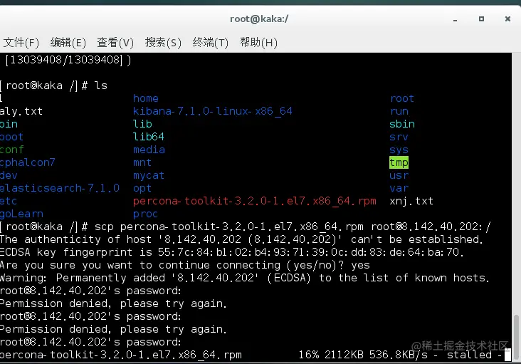 然后使用scp直接把虚拟机的文件传输到主机上,执行命令为scp percona-toolkit-3.2.0-1.el7.x86_64.rpm root@ip:/