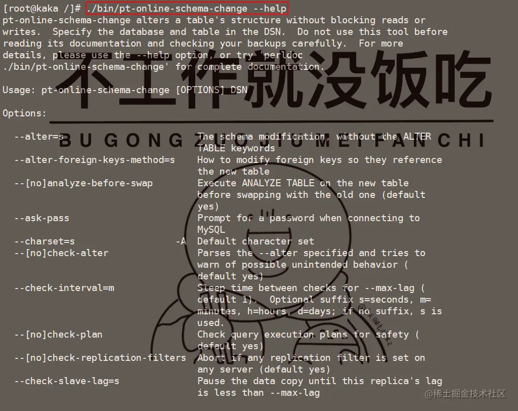 安装完成后执行./bin/pt-online-schema-change --help,出现以下界面证明你就安装成功了