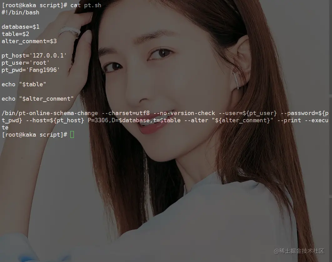/bin/pt-online-schema-change --charset=utf8 --no-version-check --user=${pt_user} --password=${pt_pwd} --host=${pt_host} P=3306,D=$database,t=$table --alter "${alter_conment}" --print --execute