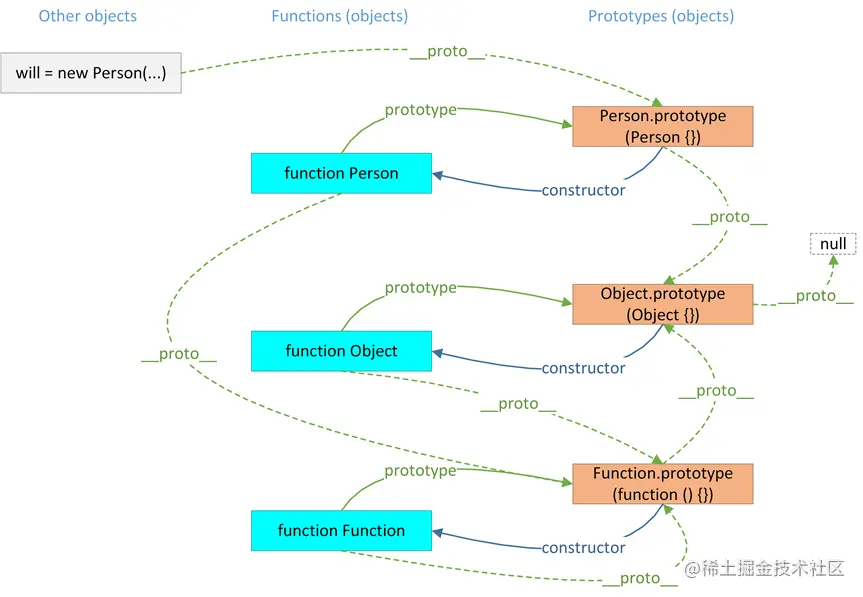 在这里,will对象本身并没有"constructor"这个属性,但是通过原型链查找,找到了will原型(will.proto)的"constructor"属性,并得到了Person函数。