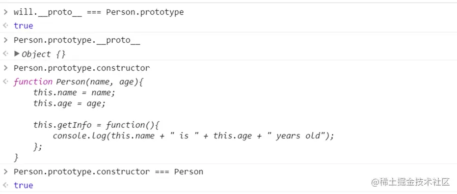 首先看 "will.proto === Person.prototype",在JavaScript中,每个函数都有一个prototype属性,当一个函数被用作构造函数来创建实例时,该函数的prototype属性值将被作为原型赋值给所有对象实例(也就是设置实例的__proto__属性),也就是说,所有实例的原型引用的是函数的prototype属性。了解了构造函数的prototype属性之后,一定就明白为什么第一句结果为true了。