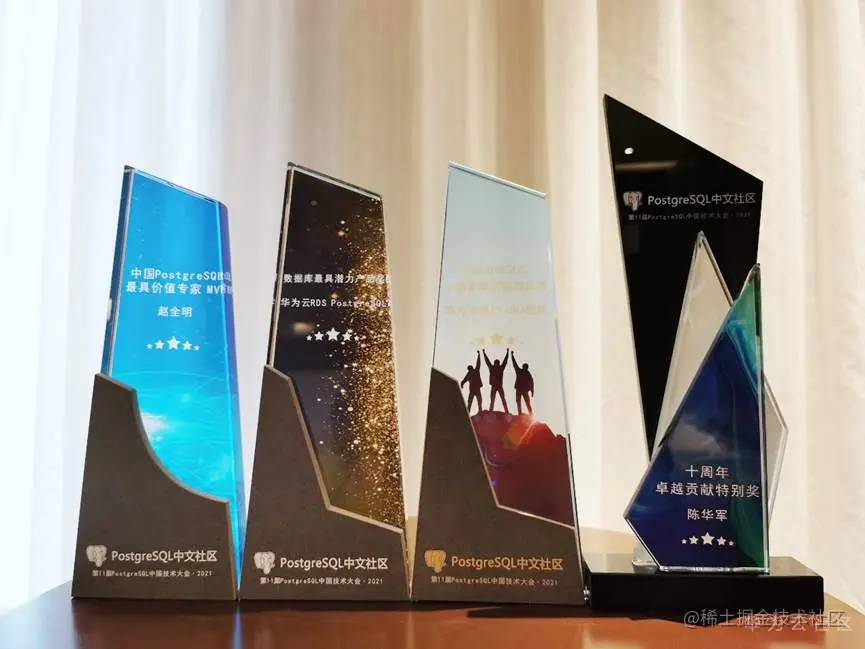 会上,华为云RDS for PostgreSQL荣获“数据库最具潜力产品奖”,华为流程IT DBA团队荣获“PostgreSQL中国最具价值团队奖”,华为数据库架构师陈华军和华为云数据库高级专家赵全明分别荣获“十周年卓越贡献特别奖”、“中国PostgreSQL最具价值专家MVP奖”。