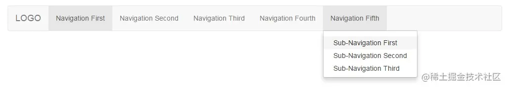 有的时候一级导航是不够的,需要搭配二级导航展示更多的内容。使用方法:首先在需要加二级导航的 <li> 元素中添加样式 dropdown,<a> 元素中添加样式 dropdown-toggle 和属性 data-toggle="dropdown";然后在 <li> 里面 <a> 下面在放一个 <ul> + <li> 组合,<ul> 标签添加样式 dropdown-menu。