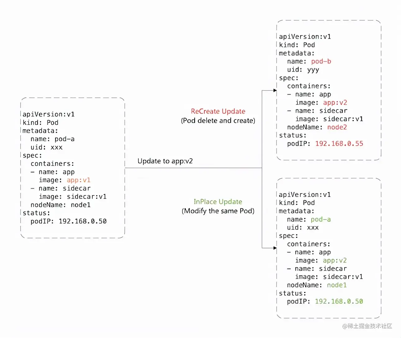 如上图所示,原地升级过程中只修改了 Pod 中的字段,因此: