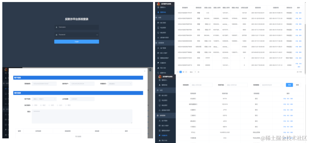 - 整理完备的电话号码段数据库、银行卡号数据库等等,进一步优化,各机构角色用户只能看自己的(参考警情)