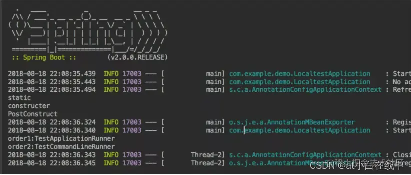 在对象注入完成后,调用带有@PostConstruct注解的方法。当容器启动成功后,再根据@Order注解的顺序调用CommandLineRunner和ApplicationRunner接口类中的run方法。