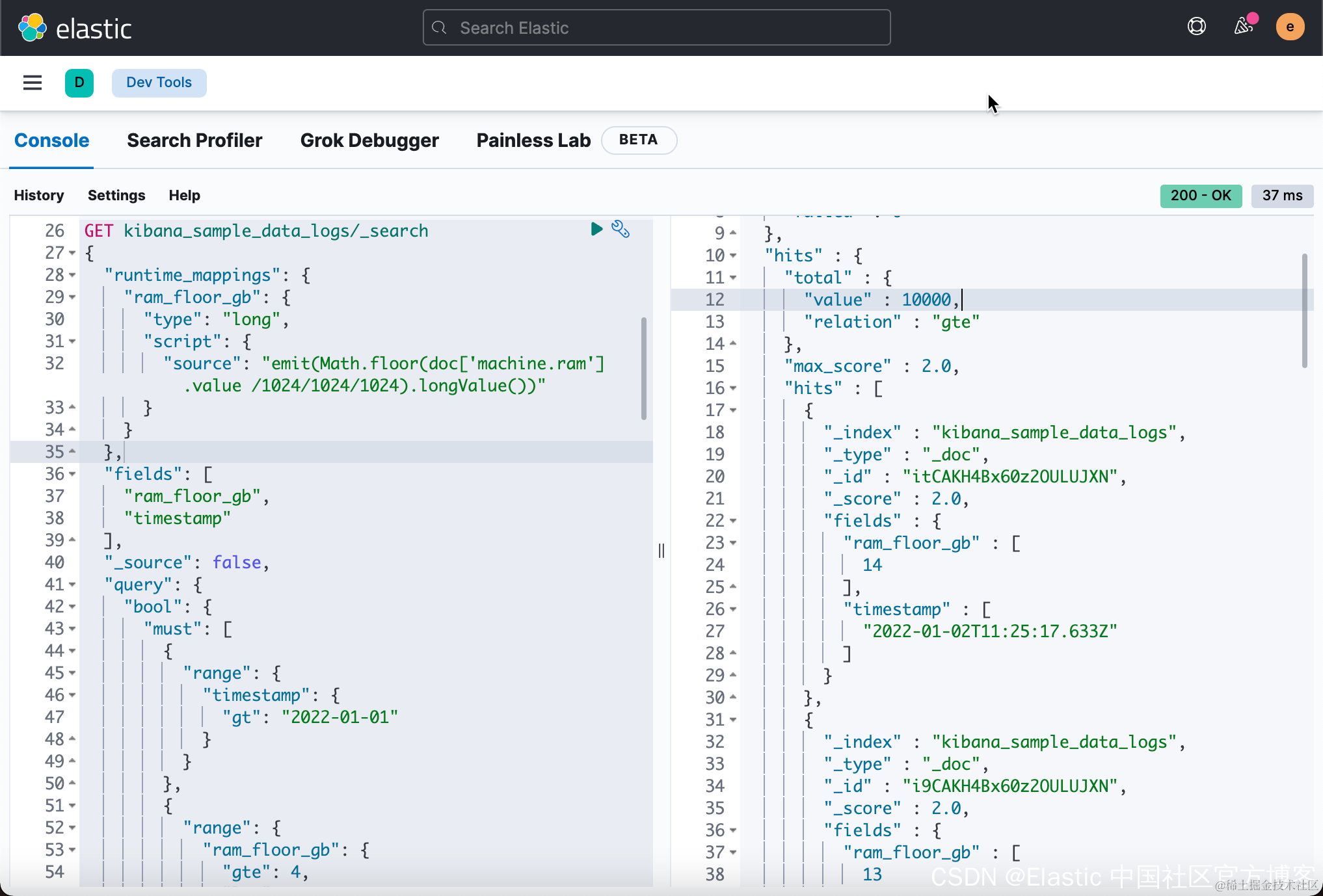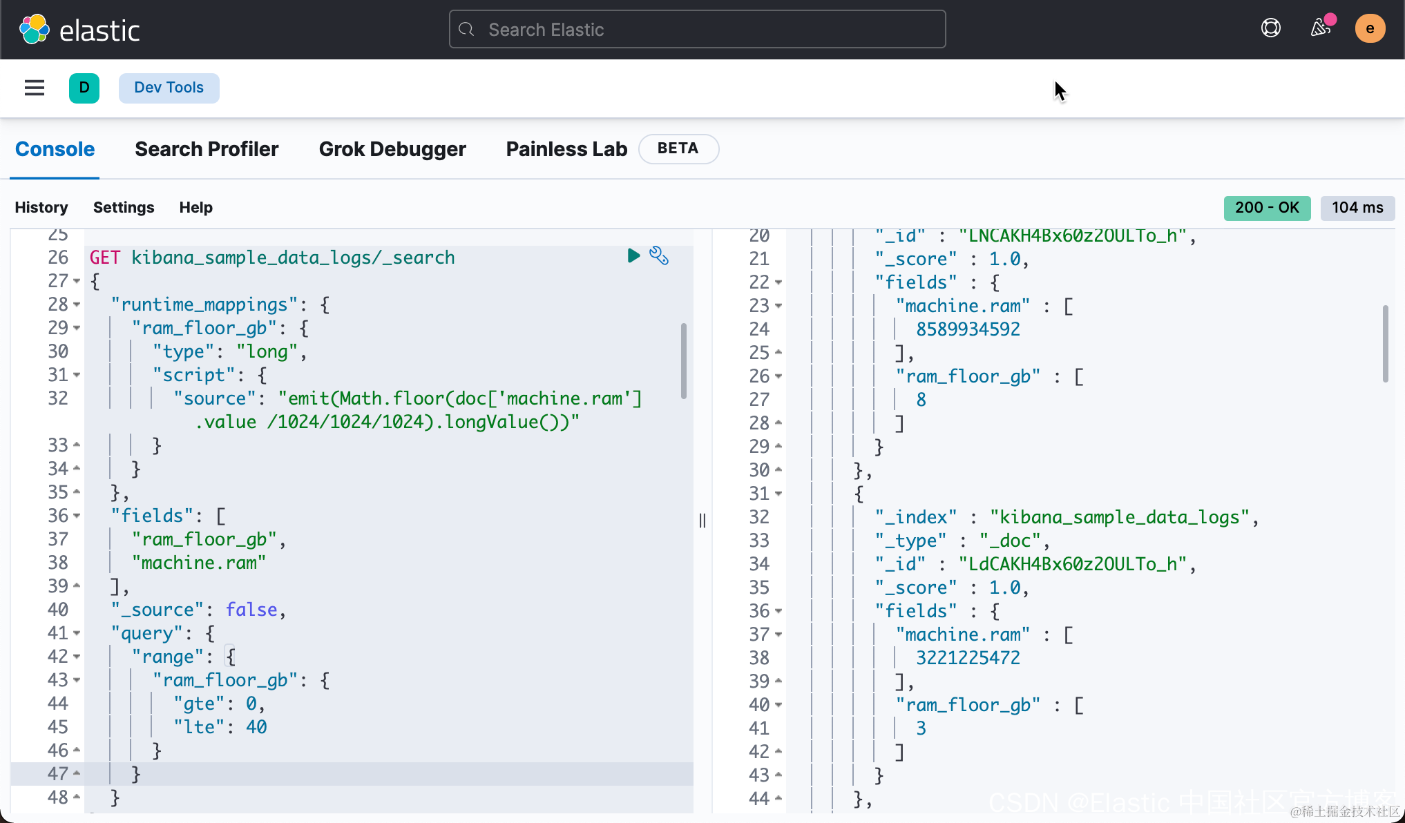在上面,我们定义了一个叫做 ram_floor_gb 的 Runtime field。它的用法基本和 Scripted fields 非常相似。那么搜索的结果是: