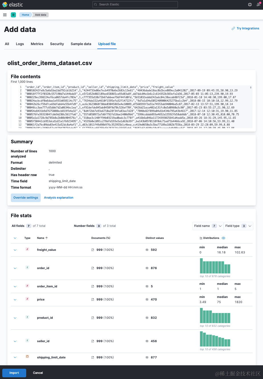 为了开始,我使用 File Visualizer 从 kaggle 导入电子商务数据集。 我下载了 olist_order_items_dataset,其中包含一个带有订单项的 CSV 文件。