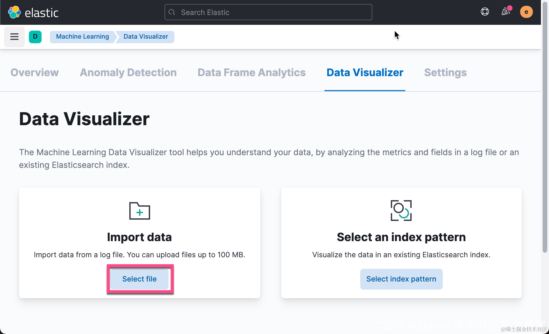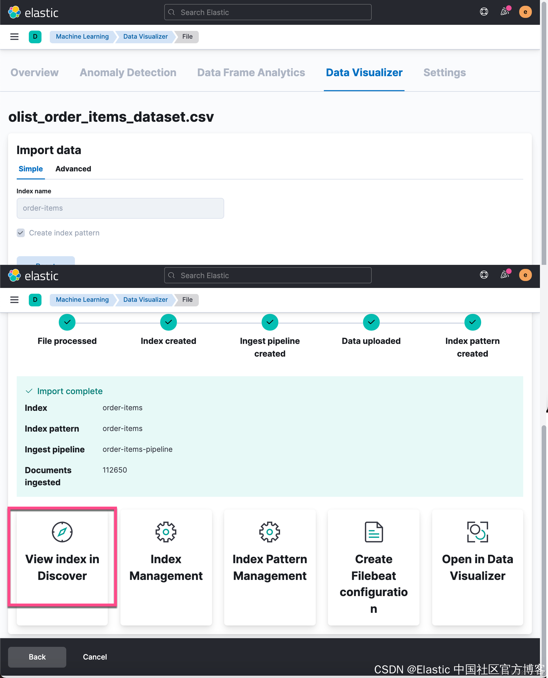从上面的过程中,我们可以看得出来 import complete。为了查看摄入的数据,我们可以点击 View index in Discover: