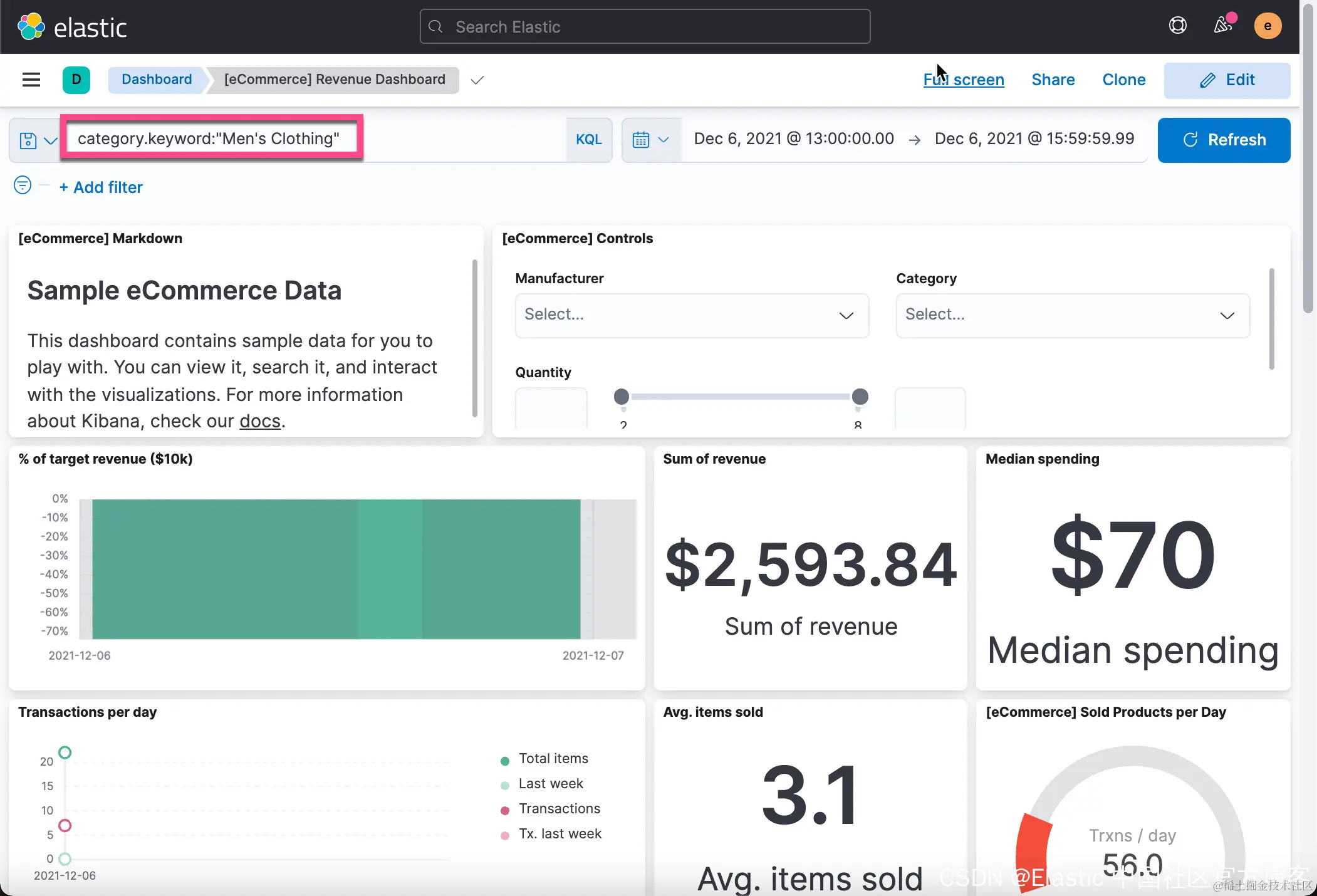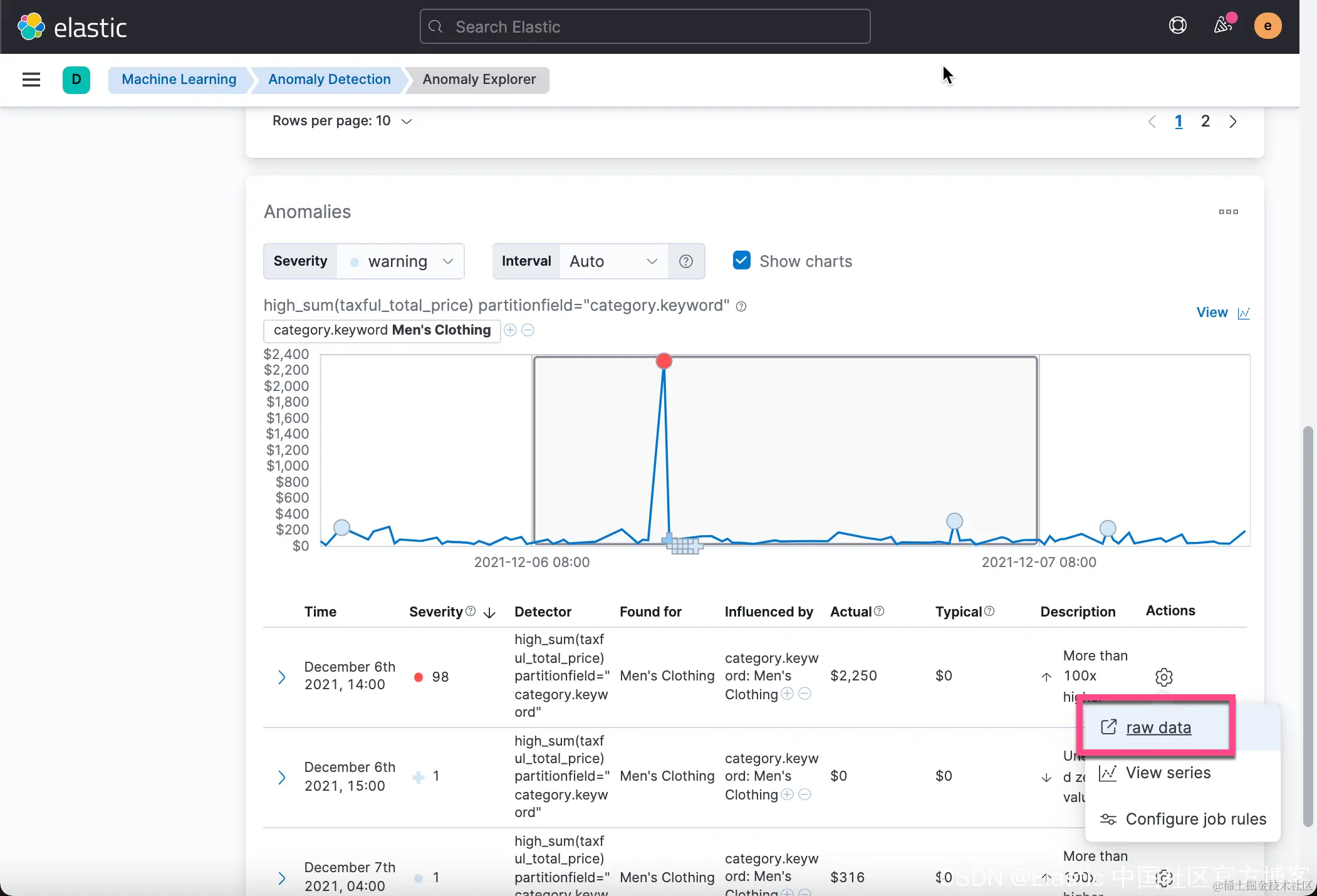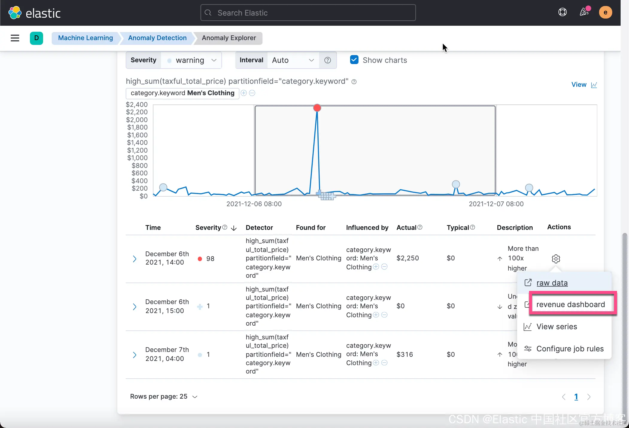从上面的图中我们可以看出来 men's clothing 这个 category 在2021-12-06那天有一个非常大的 jump,它表明当天的销售非常火爆。这个值得我们去研究一下那天到底是发生了什么事才有这么高的销售额。我们甚至想在这个视图中很方便地连接到原始的数据。我们先注意一下如下的界面: