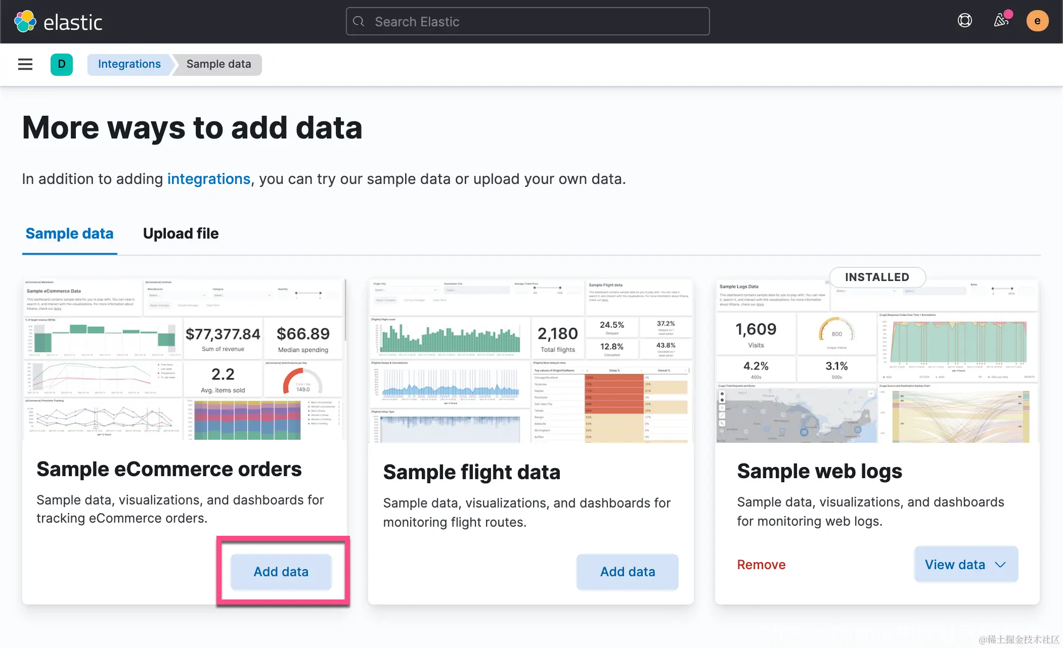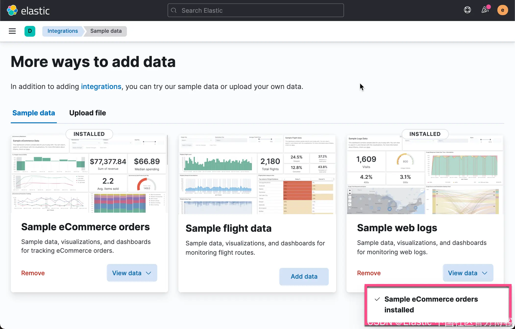 这样我们就在 Elasticsearch 中创建了一个叫做 kibana_sample_data_ecommerce 的索引。