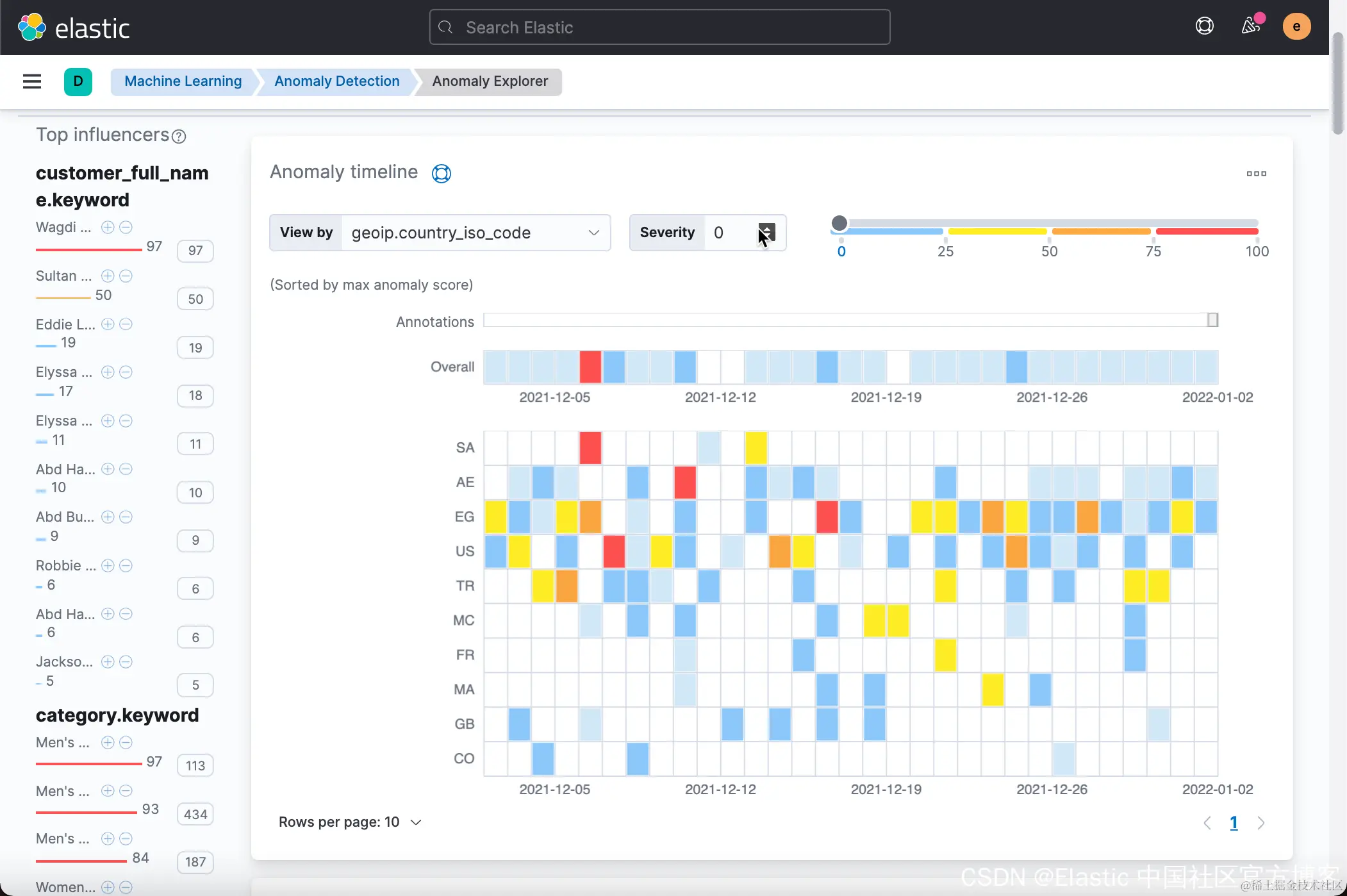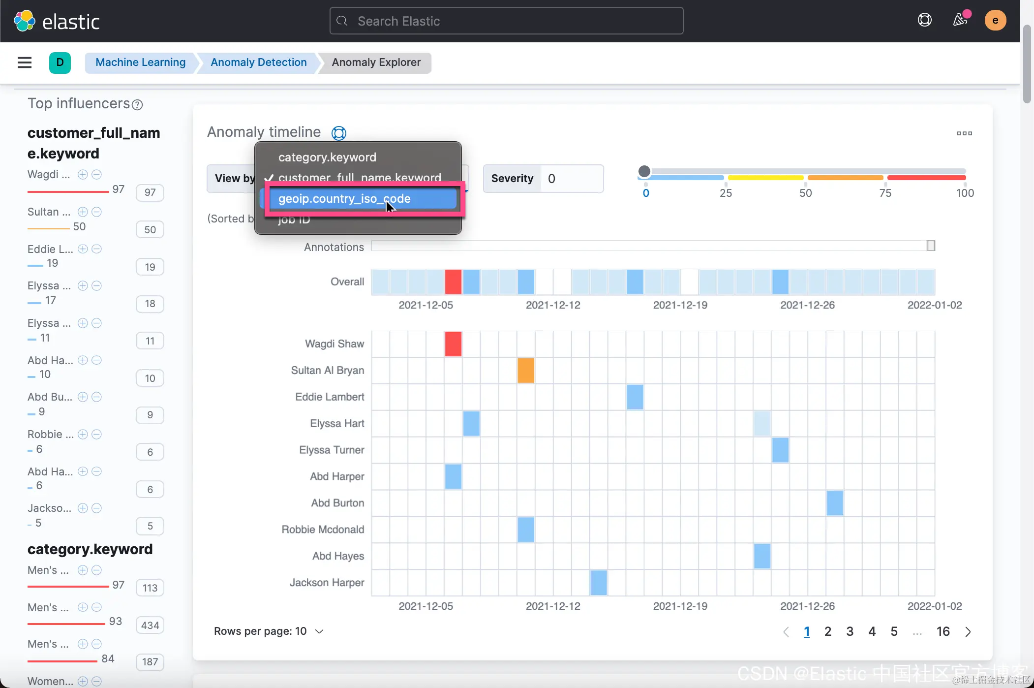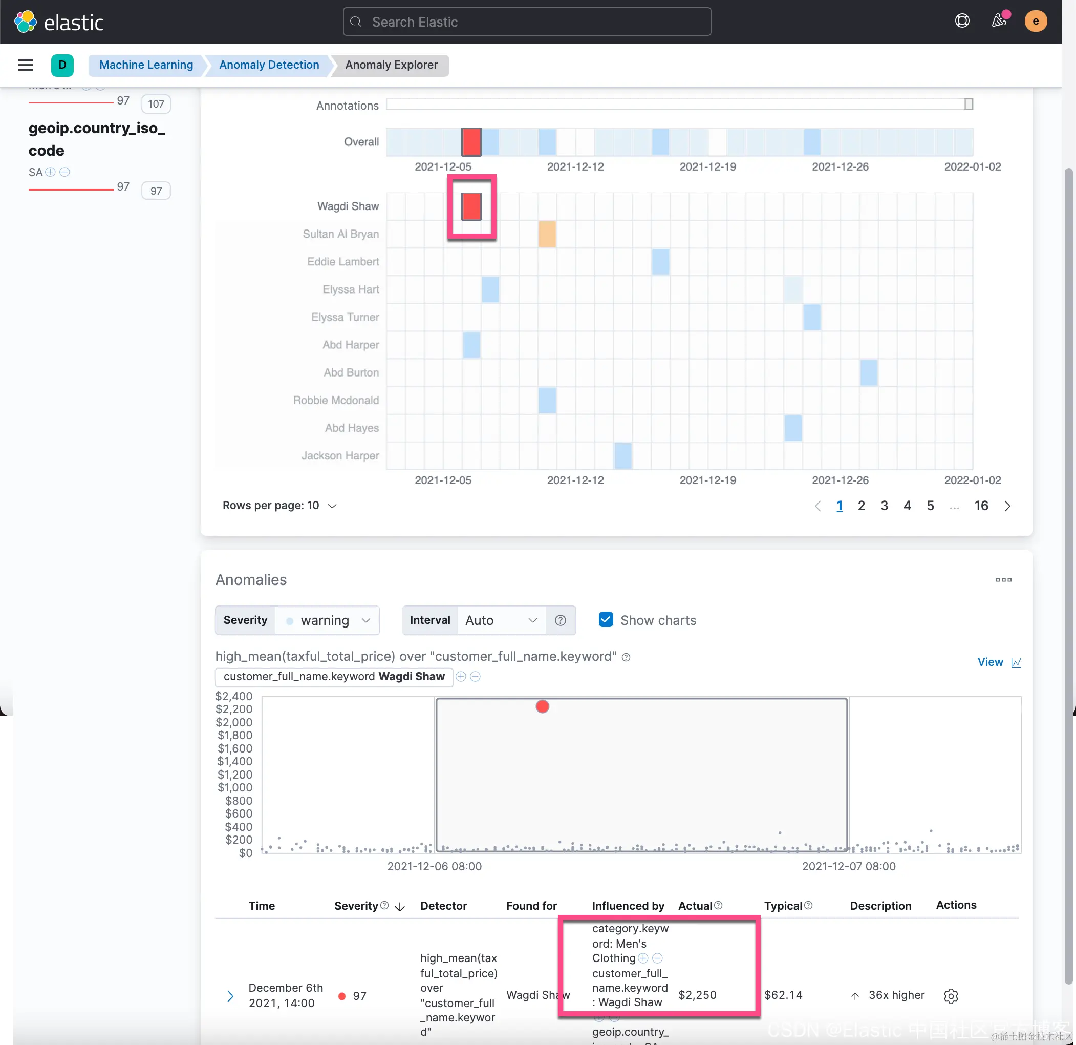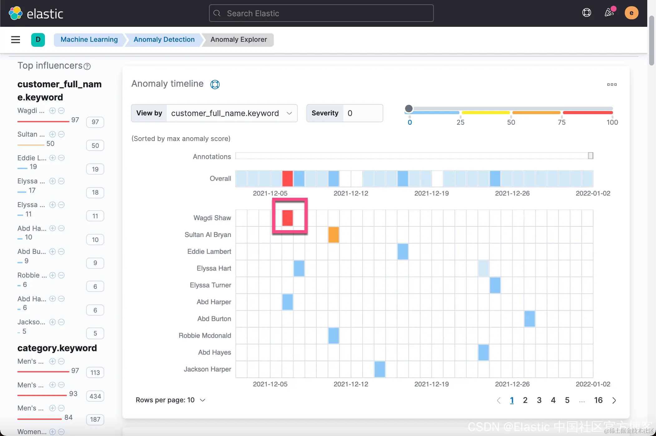 在上面的图中,它列出来一些异常的顾客。从上面的图中我们可以看出来 Wagdi Shaw 在2021-12-06日有异常。 这个是按照 customer_full_name 来进行划分的。我们也可以依据我们刚才添加的 influencer 来进行划分: