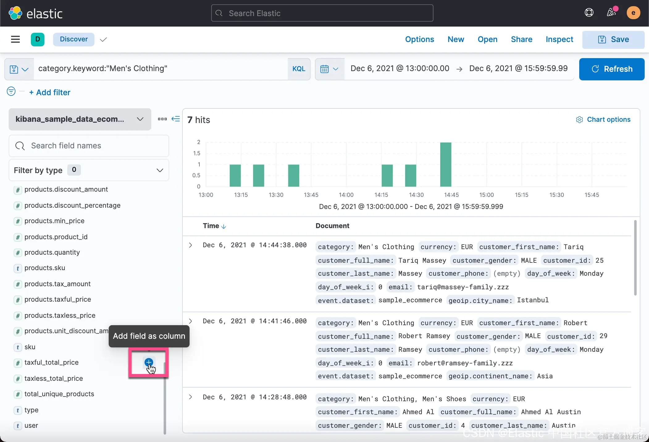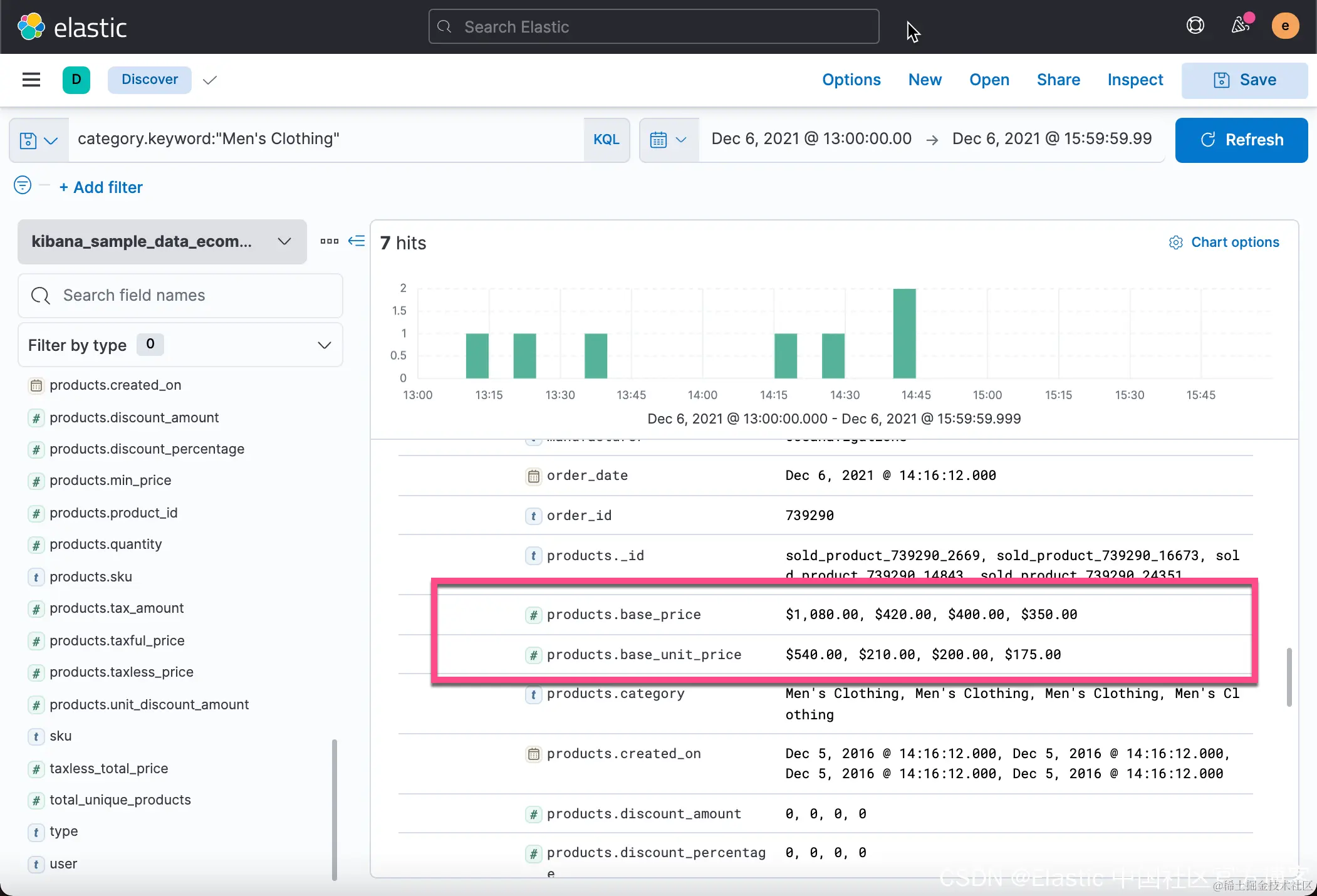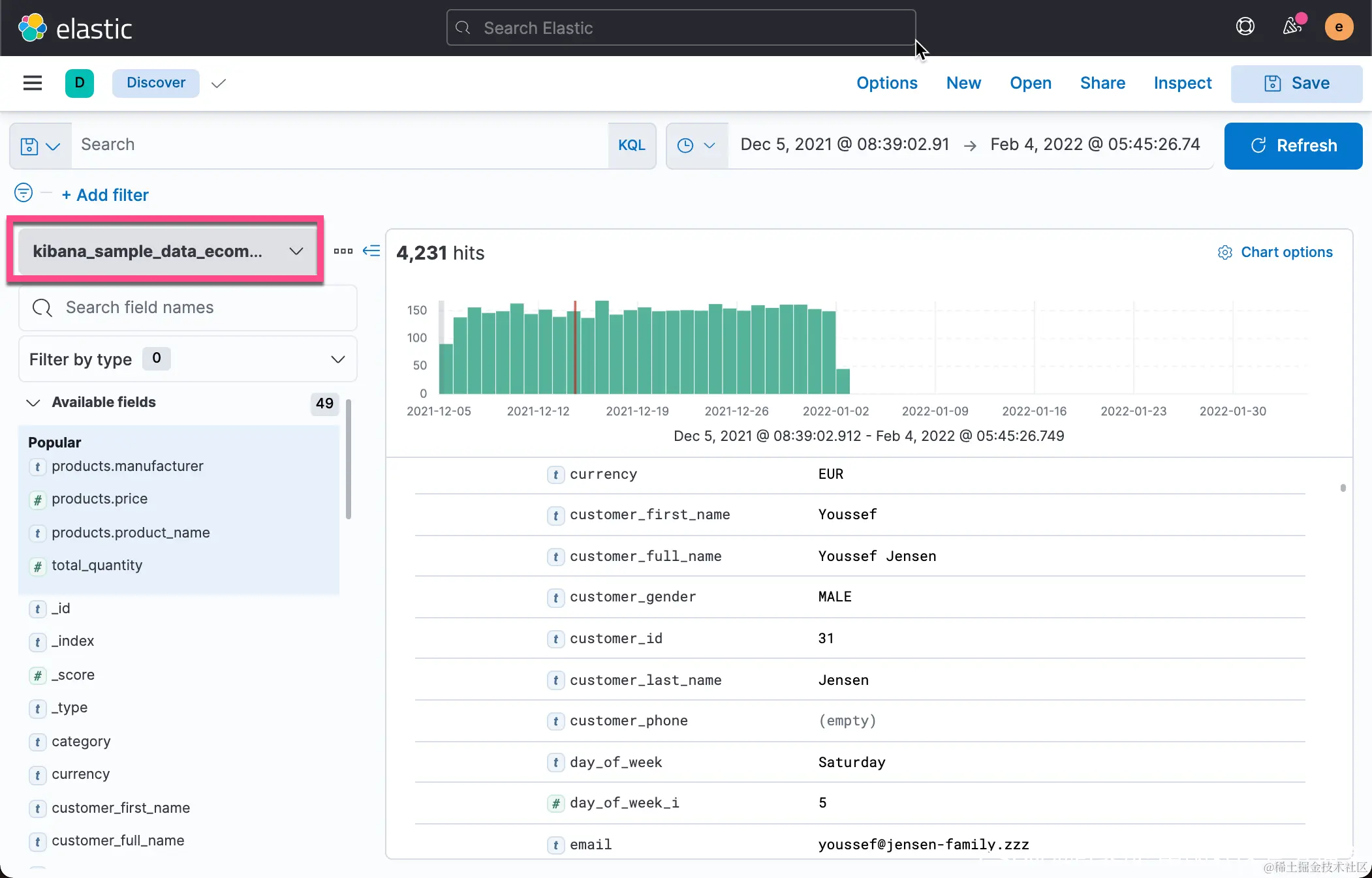 我们可以在 Discover 中查看这个索引的所有字段:
