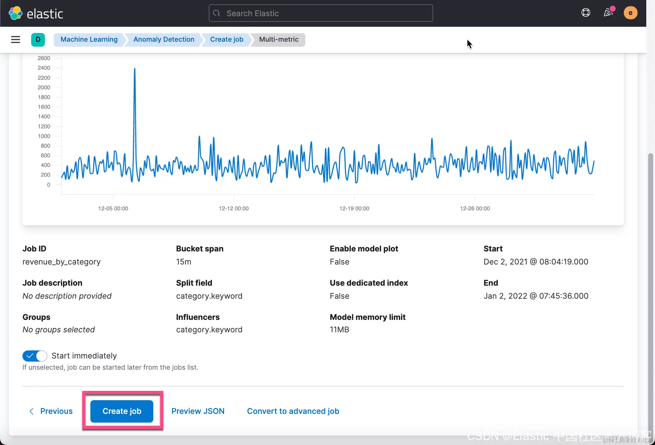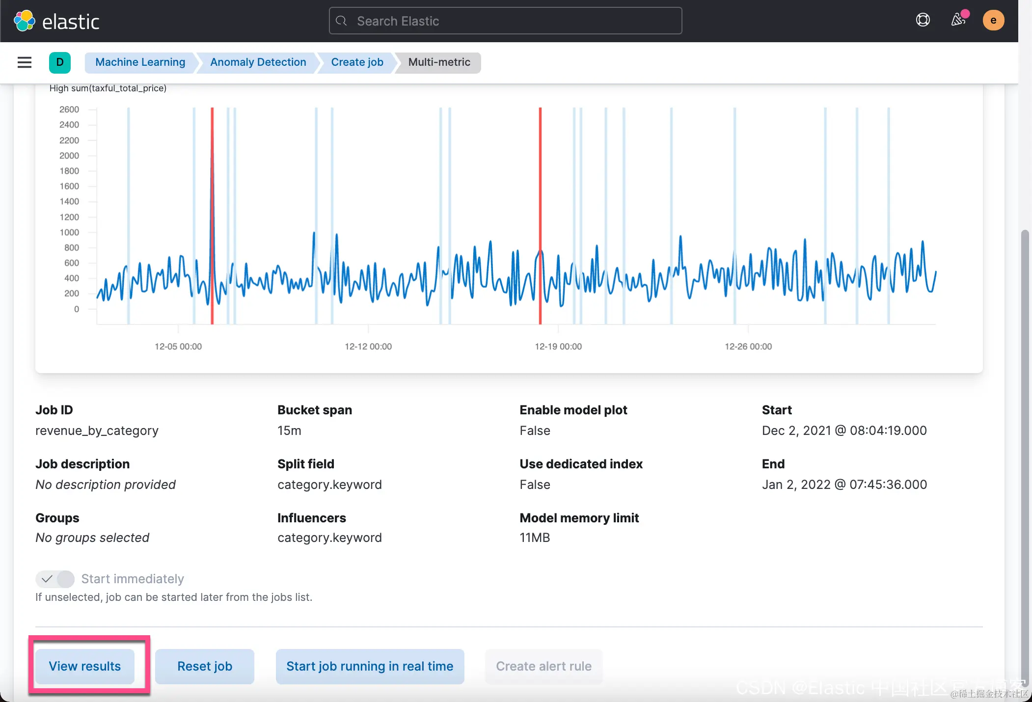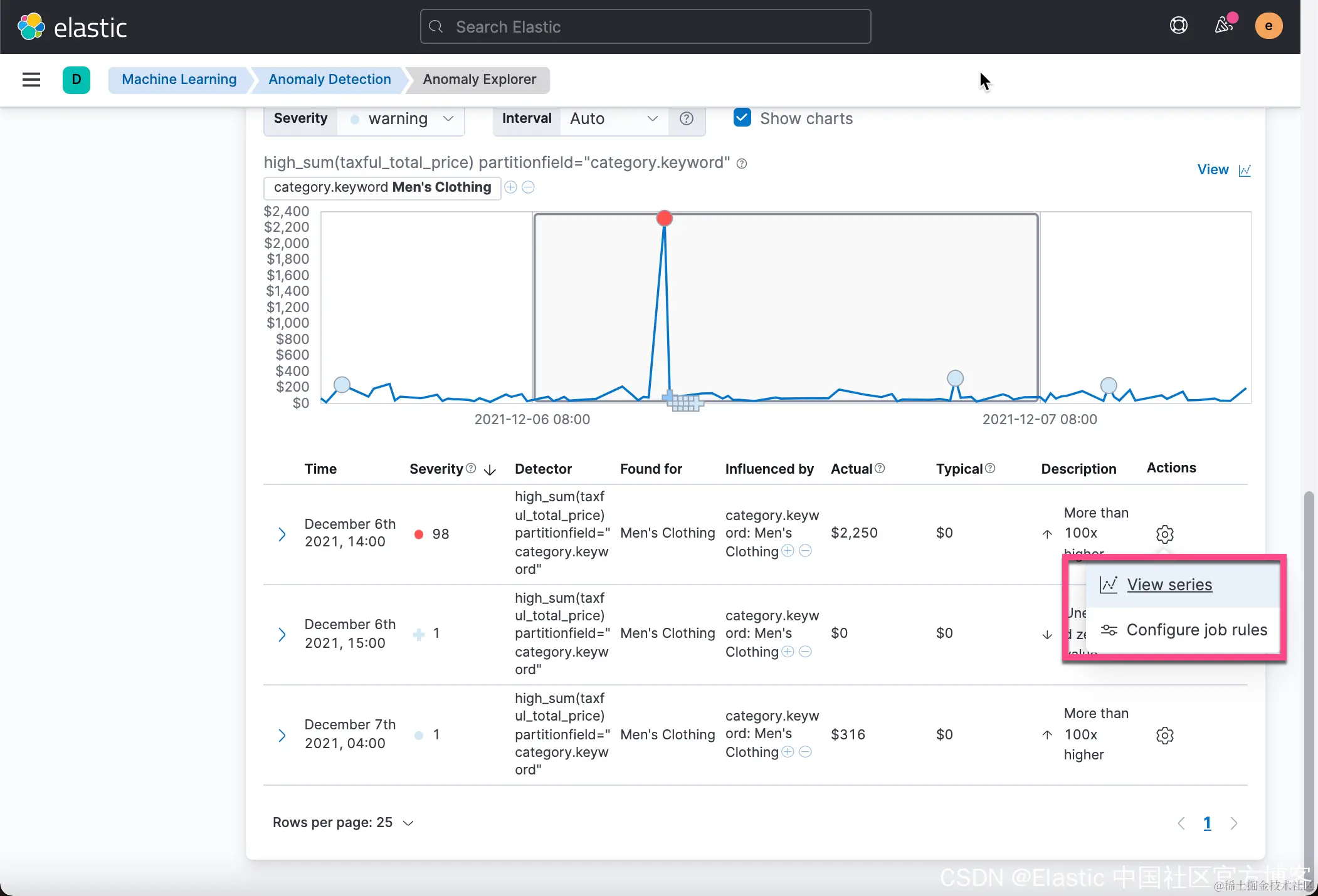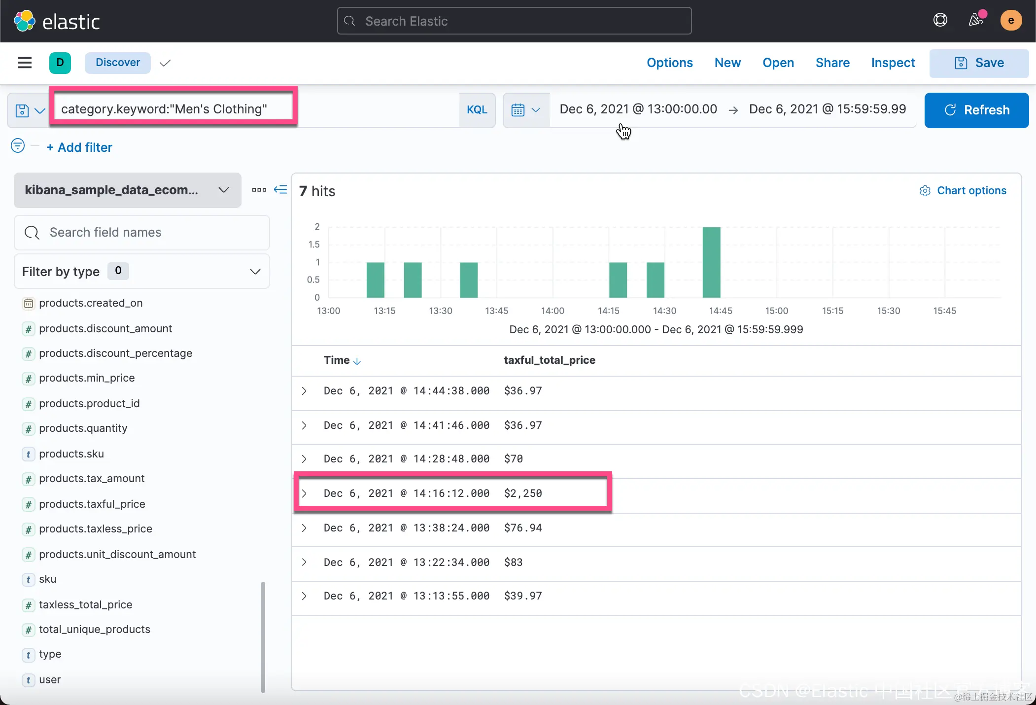 从上面的 Discover 中,我们可以看到在 2021-12-06 有一个订单的价值是2,250美金。这个销售额比平时的值要大很多。
