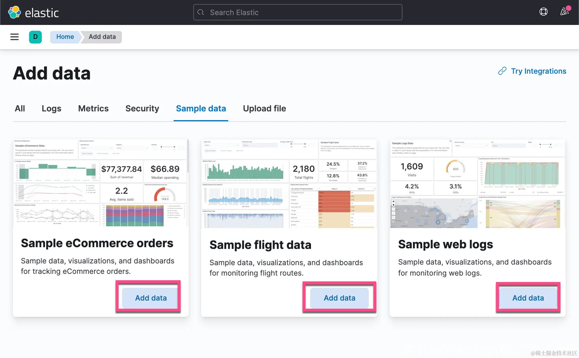 在三个数据集是 Kibana 自带的数据。我们可以针对这些数据进行各种分析。