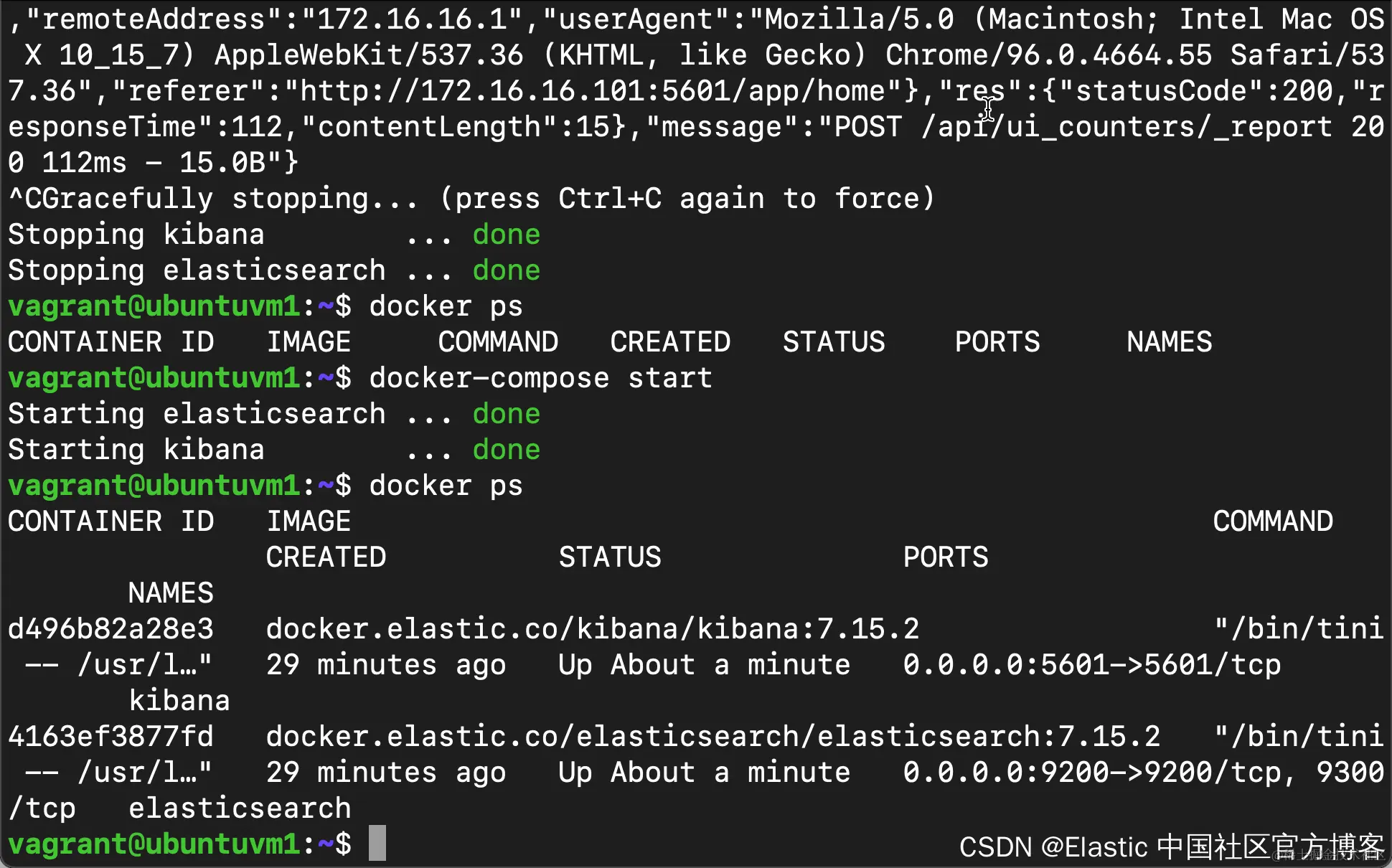 我们可以看到没有任何运行的 container。我们可以使用如下的命令来重新启动 Elasticsearch 及 Kibana: