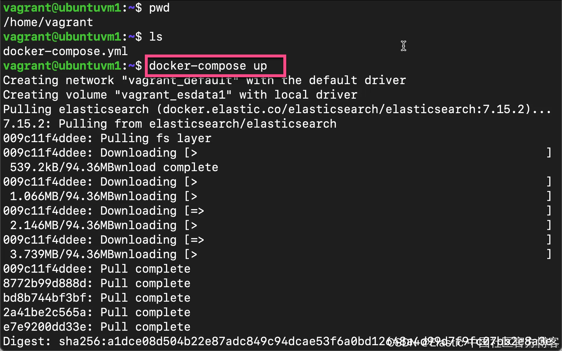 上面显示我们的数据是一个 local 的叫做 vagrant_esdata1 的卷。它实际上是在我们的 docker-compose.yml 里定义的: