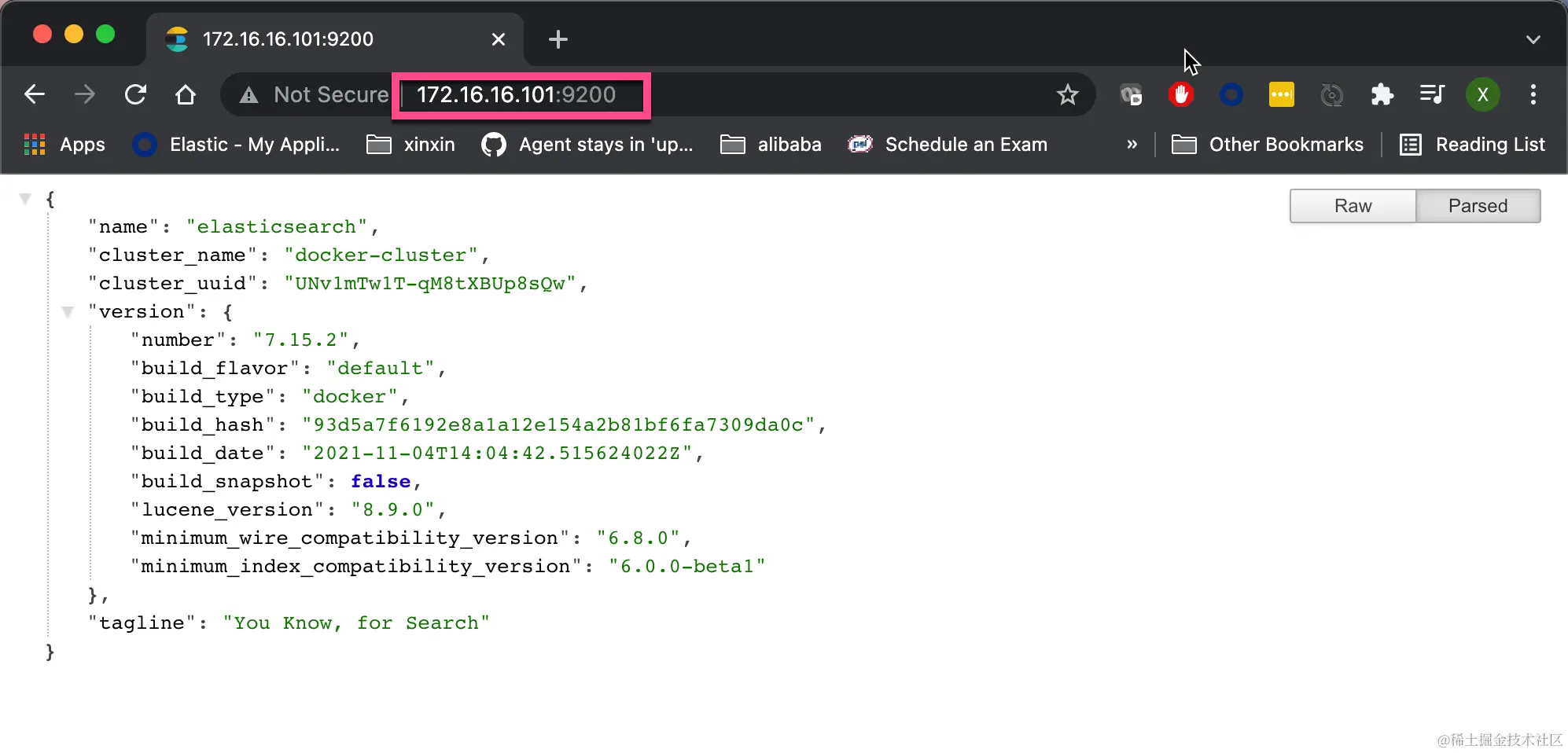 也即,它可以在 localhost 被访问。当让我们也可以在浏览器中输入如下的地址 http://172.16.16.101:9200/: