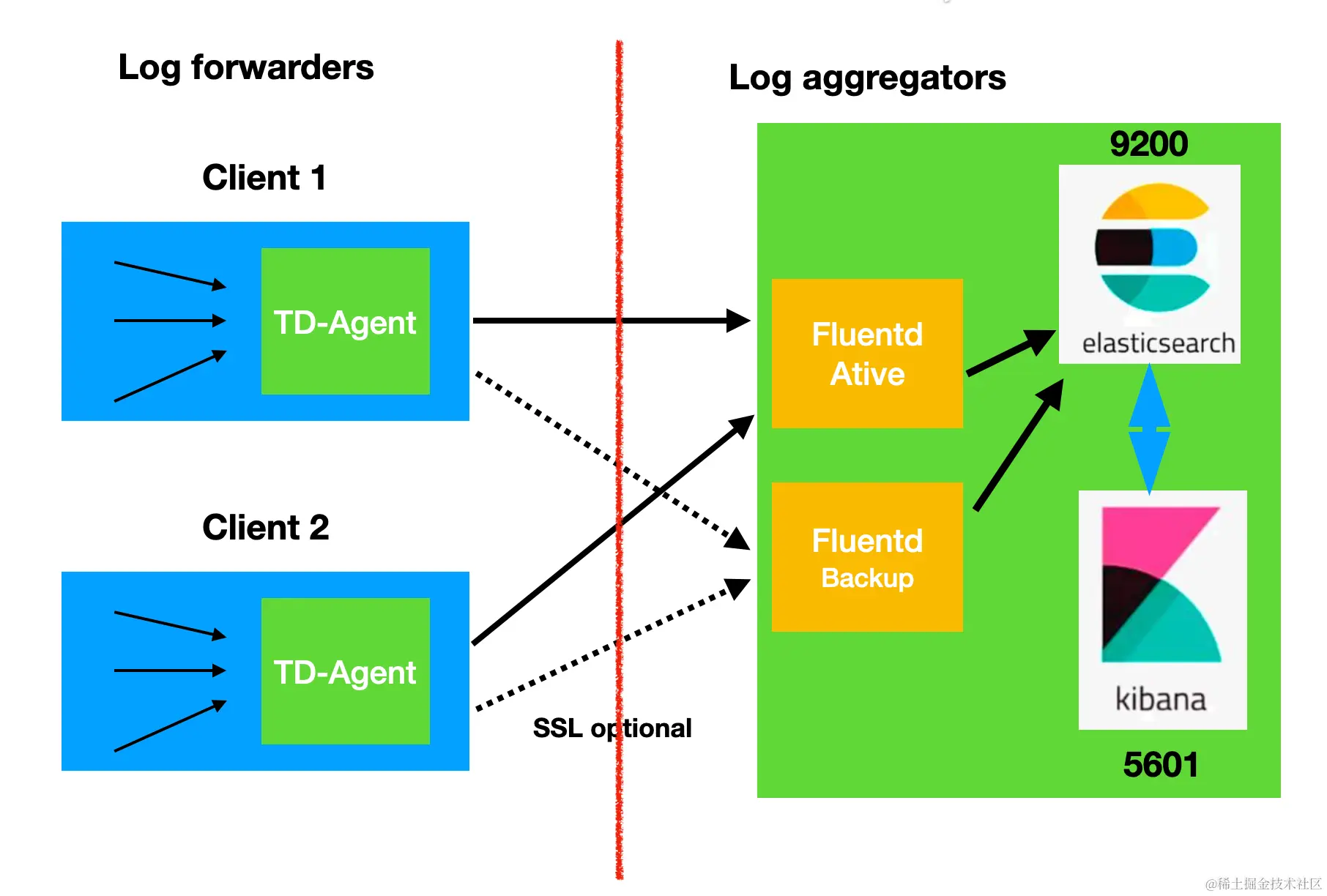 在我之前的文章 “Elastic:使用 Fluentd 及 Elastic Stack 进行应用日志采集”,我详细地介绍了如何使用 Elastic Stack 及 Fluentd 来收集一个 nodejs 服务器的日志信息。在今天的文章中,我将详细地介绍如何使用 Docker 来部署 Elastic Stack 及 Fluentd。在我们的设计中,我们把 Fluentd 作为一个日志收集器,并最终把所有的日志写入到 Elasticsearch 中。我们的设计框图如下: