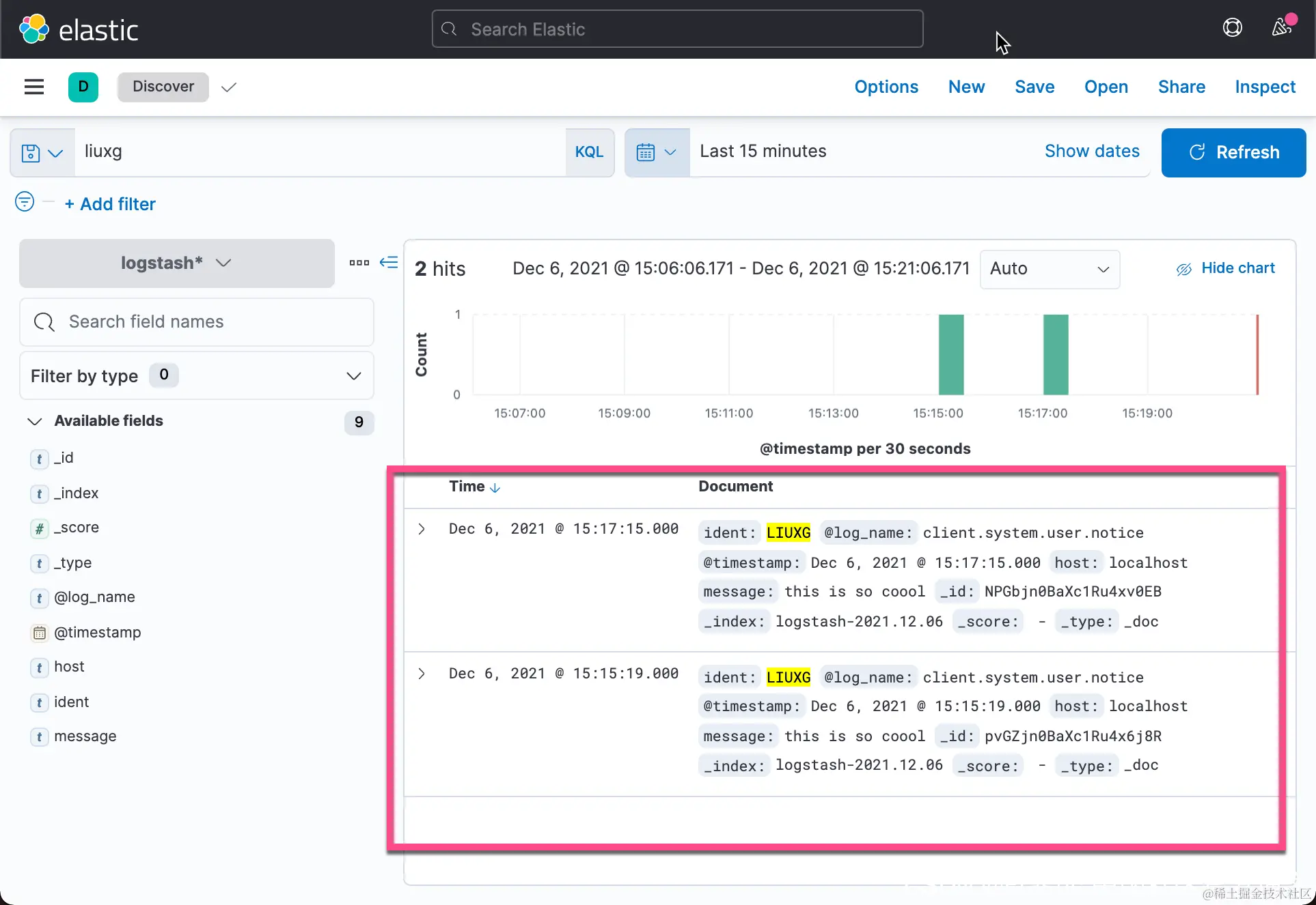 我们可以在 Discover 中查看这个索引的所有内容:
