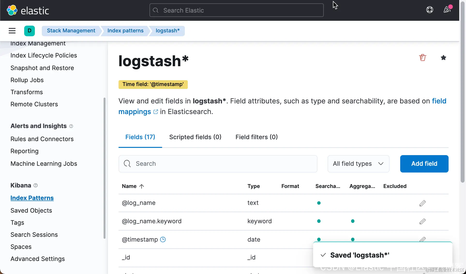 这样我们就创建了一个叫做 logstash* 的索引模式。
