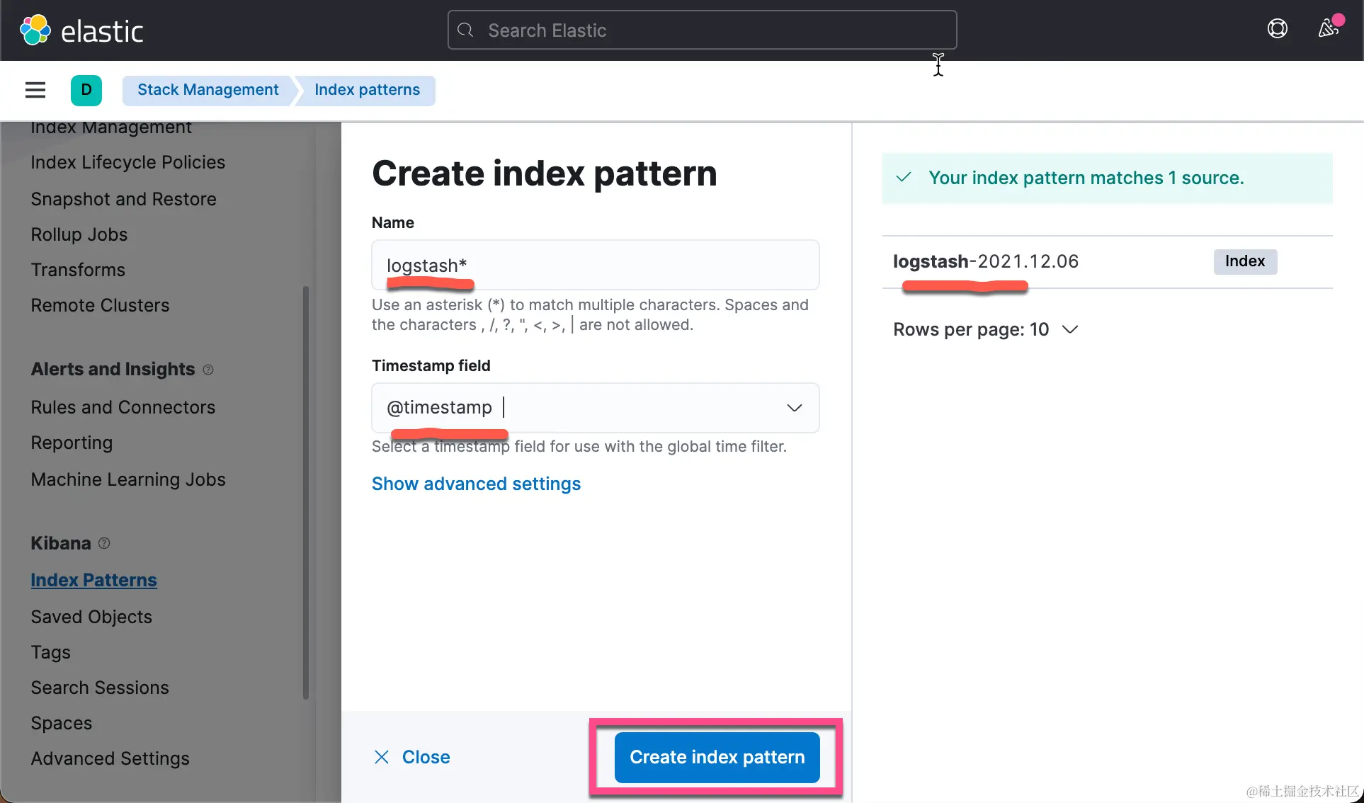 我们可以看到一个以 logstash 为开头的索引。点击上面的 Create index pattern: