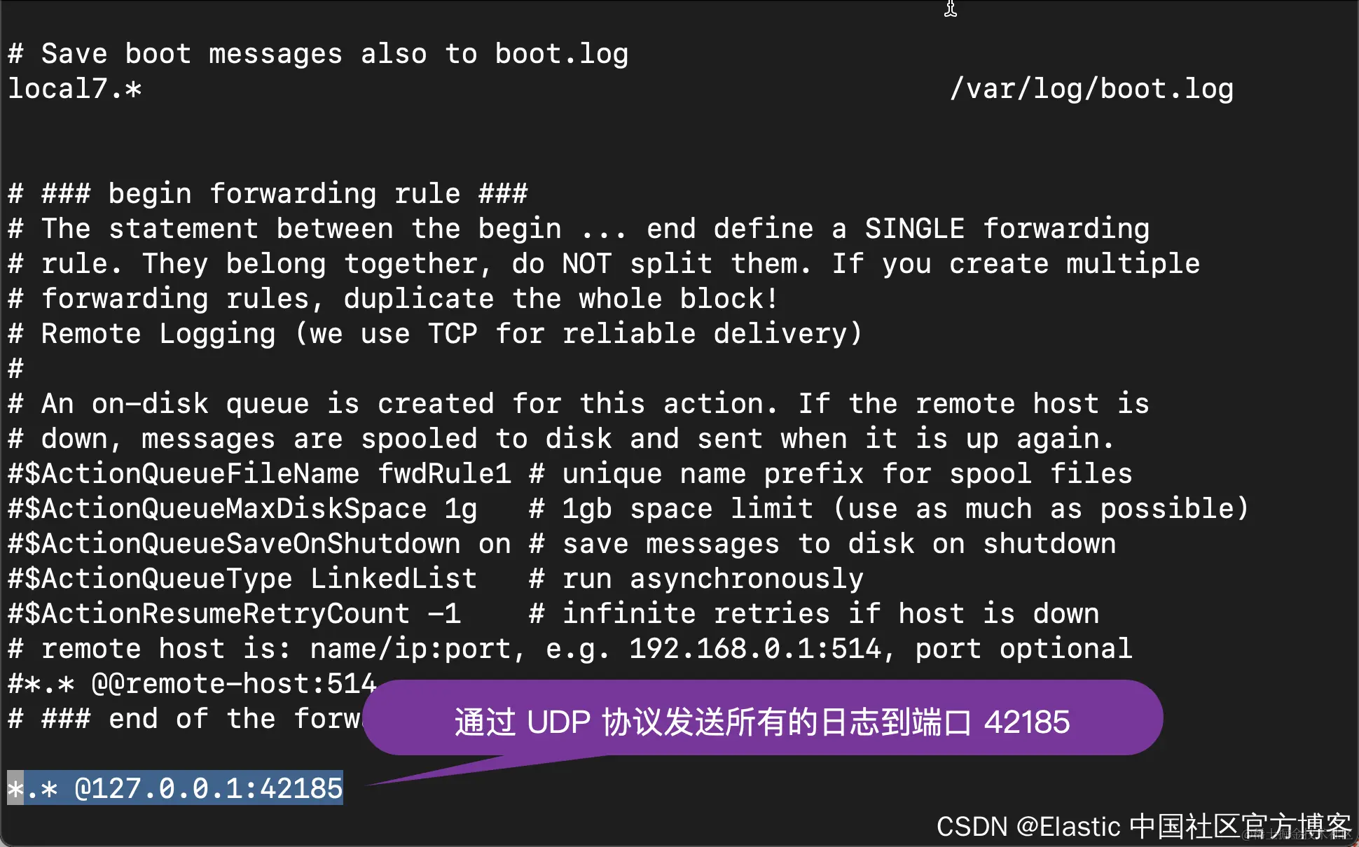在上面,我们定义了源及需要 forward 的 fluentd 的 IP 地址。针对源的配置,我们使用 UDP 协议。所有来自端口 42185 的日志信息都会自动转发到 fluentd 的收集器器中。