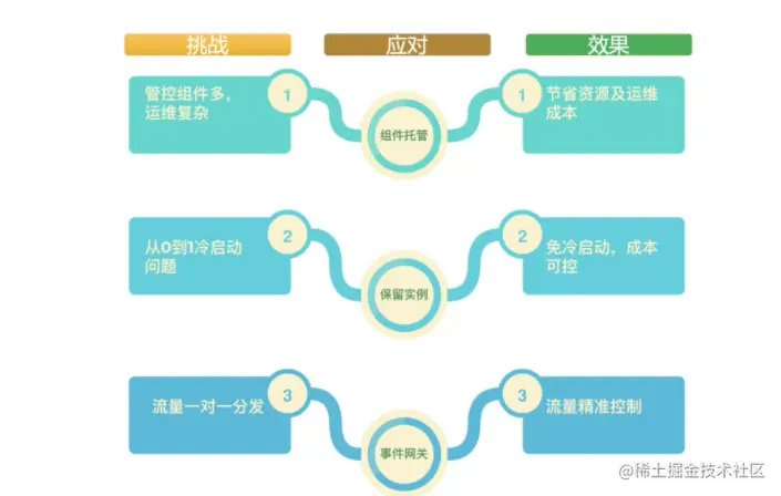 我们提供组件托管,帮助用户节省资源及运维成本;当请求为 0 时,缩容到低规格保留实例,实现请求 0 到 1 免冷启动,做到成本可控;提供自研事件网关,做到流量的精准控制。