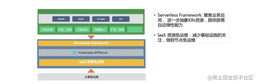 这里我们通过 Serverless Framework ,聚焦业务应用,进一步抽象 Kubernetes 资源,提供按需使用自动弹性的能力。通过 IaaS 资源免运维,减少对基础设施的关注,做到节点免运维。