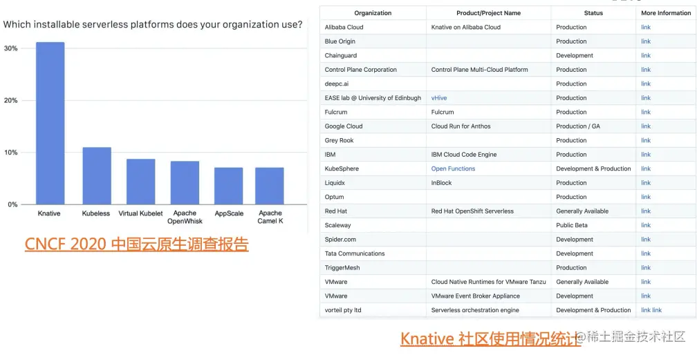 根据 CNCF 2020 中国云原生调查报告,Knative 已经成为 Kubernetes 上最广泛安装的无服务器。