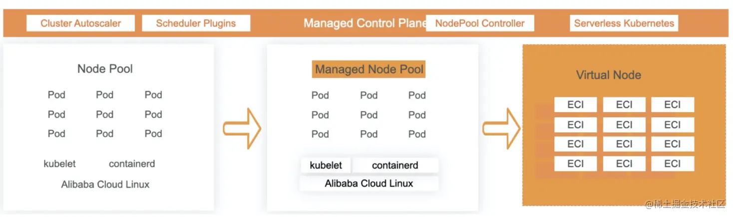 原生的 Kubernetes 节点资源需要用户自行维护,为了降低用户维护节点成本,我们提供了托管节点池,帮助用户维护节点的生命周期,但用户还是需要对托管节点池策略进行维护,更近一步在 Serverless Kubernetes 中通过虚拟节点结合弹性容器实例 ECI,让用户彻底摆脱对 IaaS 的运维。