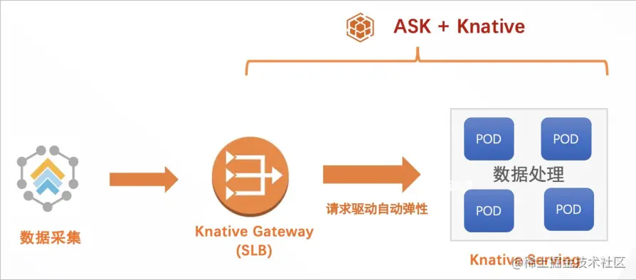 使用 Knative + ASK 作为 Serverless 架构。数据采集之后,通过服务网关访问数据处理服务,数据处理服务根据请求量按需自动扩缩容。