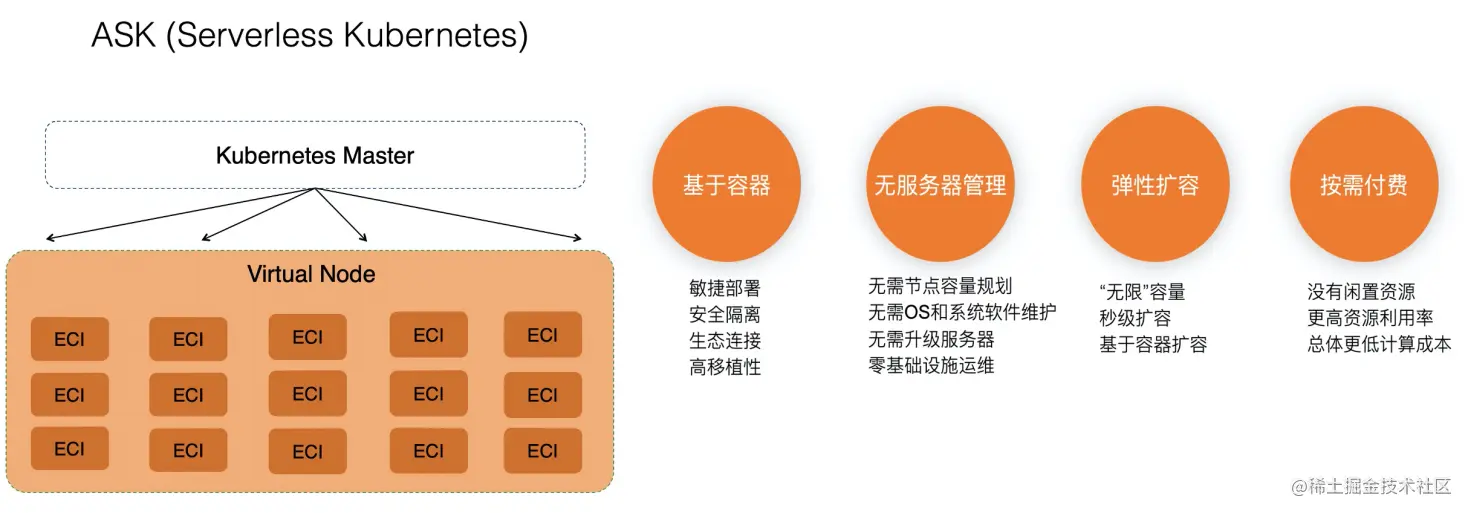 一句话:Serverless Kubernetes 基于 Kubernetes 之上,提供按需使用、节点免运维的 Serverless 能力,让开发者真正实现通过 Kubernetes 标准化 API 进行 Serverless 应用编程,值得关注。