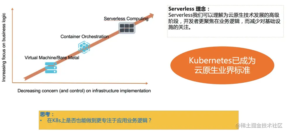 那么我们回到 Serverless 上面来,Serverless 的核心理念在于让开发者更聚焦业务逻辑,减少对基础设施的关注。那么我们如何在云原生业界标准之上做 Serverless,Kubernetes 是否也能做到更专注于应用业务逻辑。